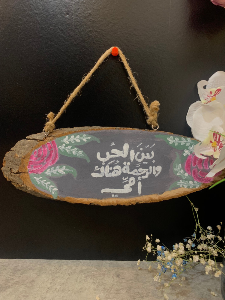 تعليقة خشبية مع رسمة ومخطوطة